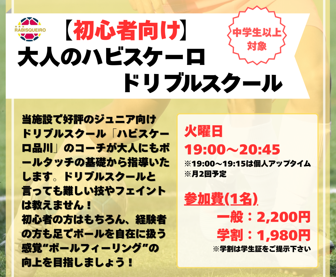 多数のスクール生が在籍し、当施設でも好評のジュニア向けドリブルスクール「ハビスケーロ品川」のコーチが大人にもボールタッチの基礎から指導いたします。ドリブルスクールと言っても難しい技やフェイントは教えません!初心者の方はもちろん、経験者の方も足でボールを自在に扱う感覚“ボールフィーリング”の向上を目指しましょう!中学生や高校生も大歓迎!